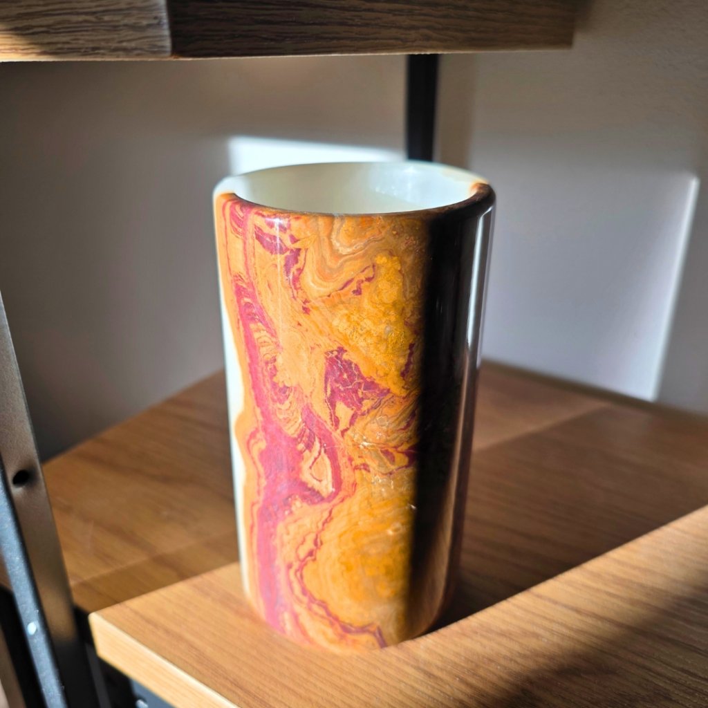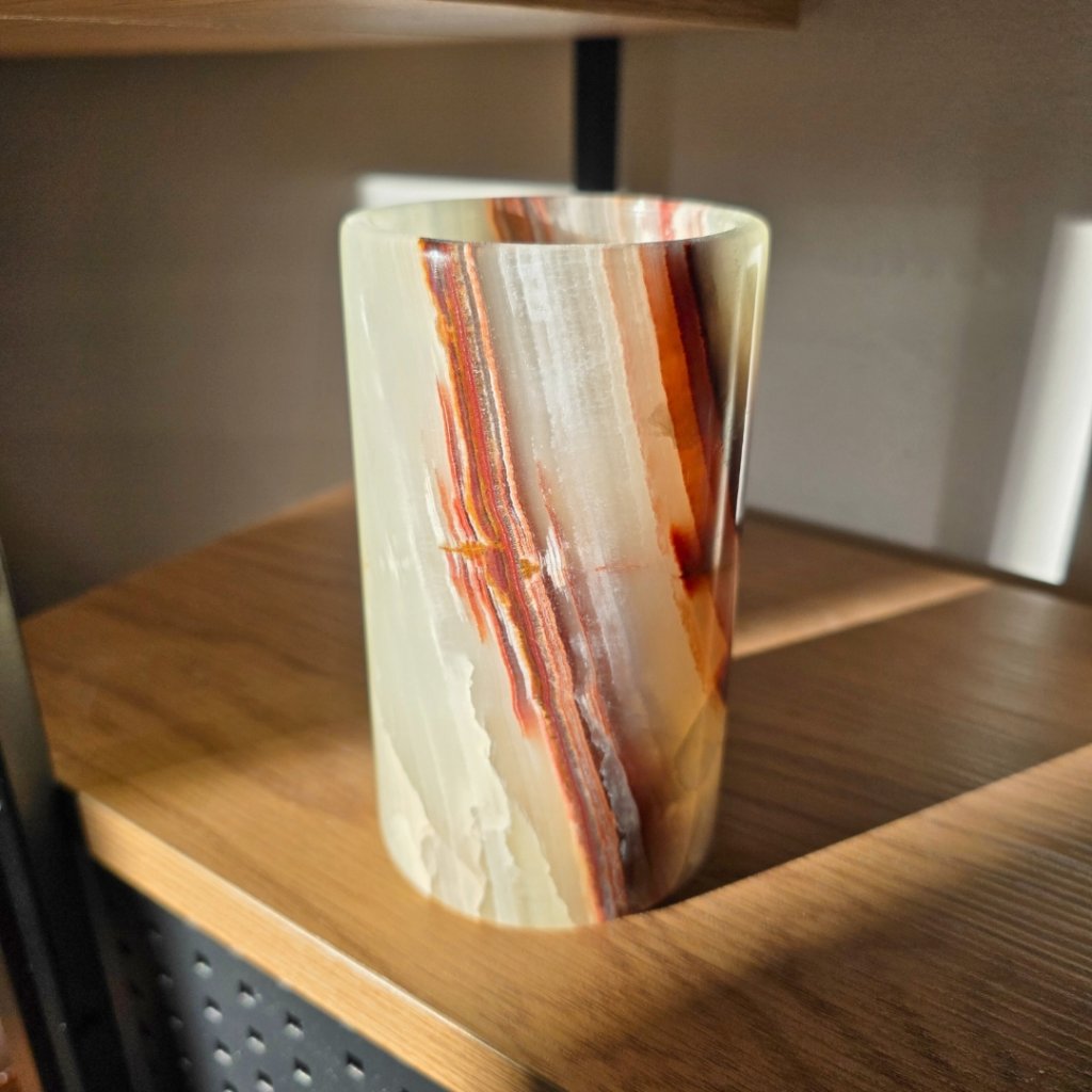 Svícen je vyroben z přírodního aragonitu, který je známý jako pákistánský onyx. Tento kámen vyniká pevností, jemným leskem a nádherným žilkováním. Každý kus je originál, má jiný vzor, barvu i průsvitnost. Když do něj vložíte čajovou svíčku, světlo začne jemně prosvítat kamennou strukturou a vytvoří hřejivou, uklidňující atmosféru. Je to doplněk, který působí klidně a elegantně zároveň, a hodí se jak do obýváku, tak i do koupelny nebo na terasu.
