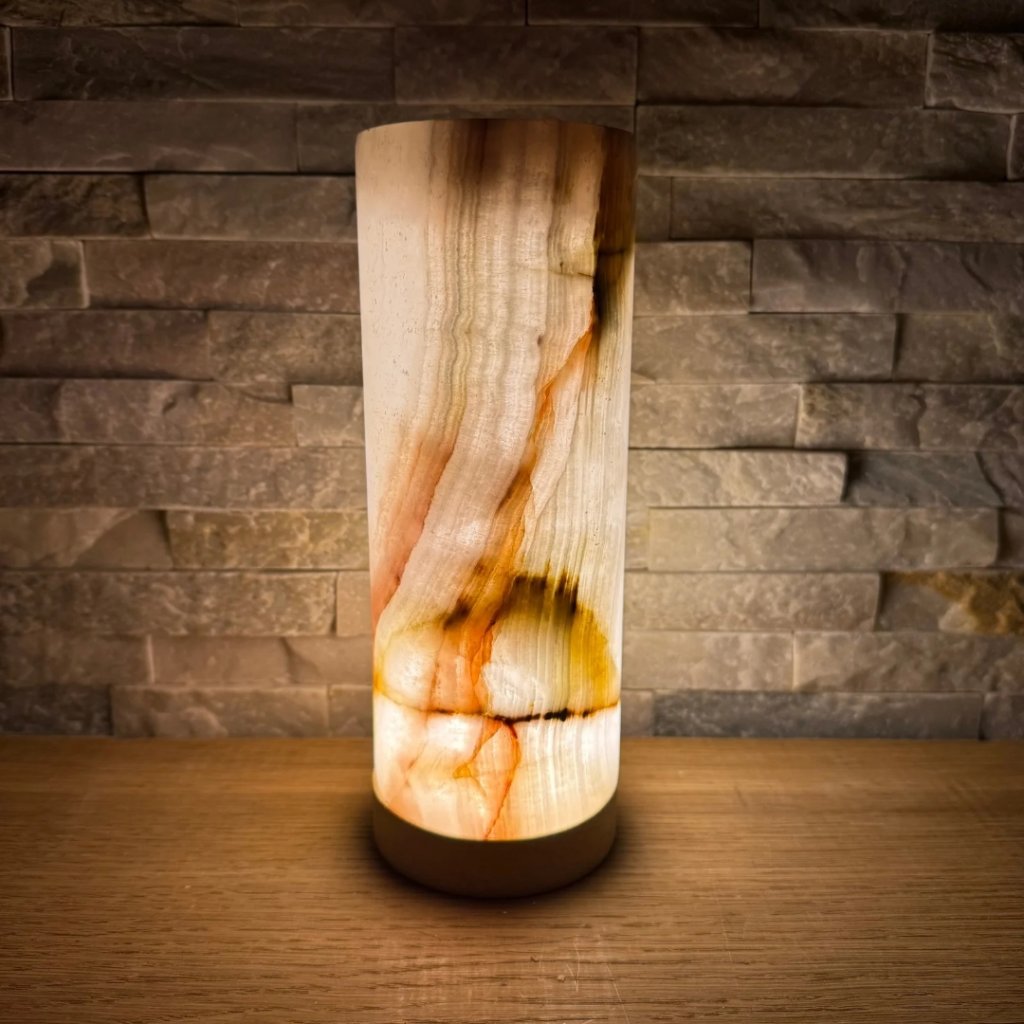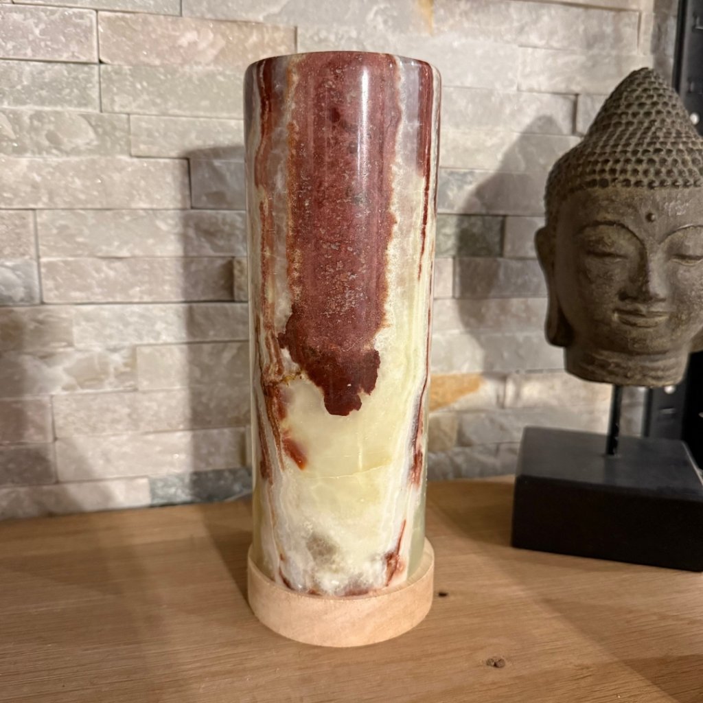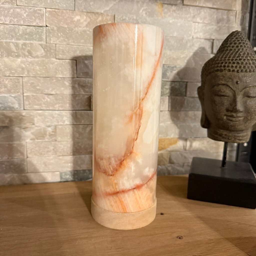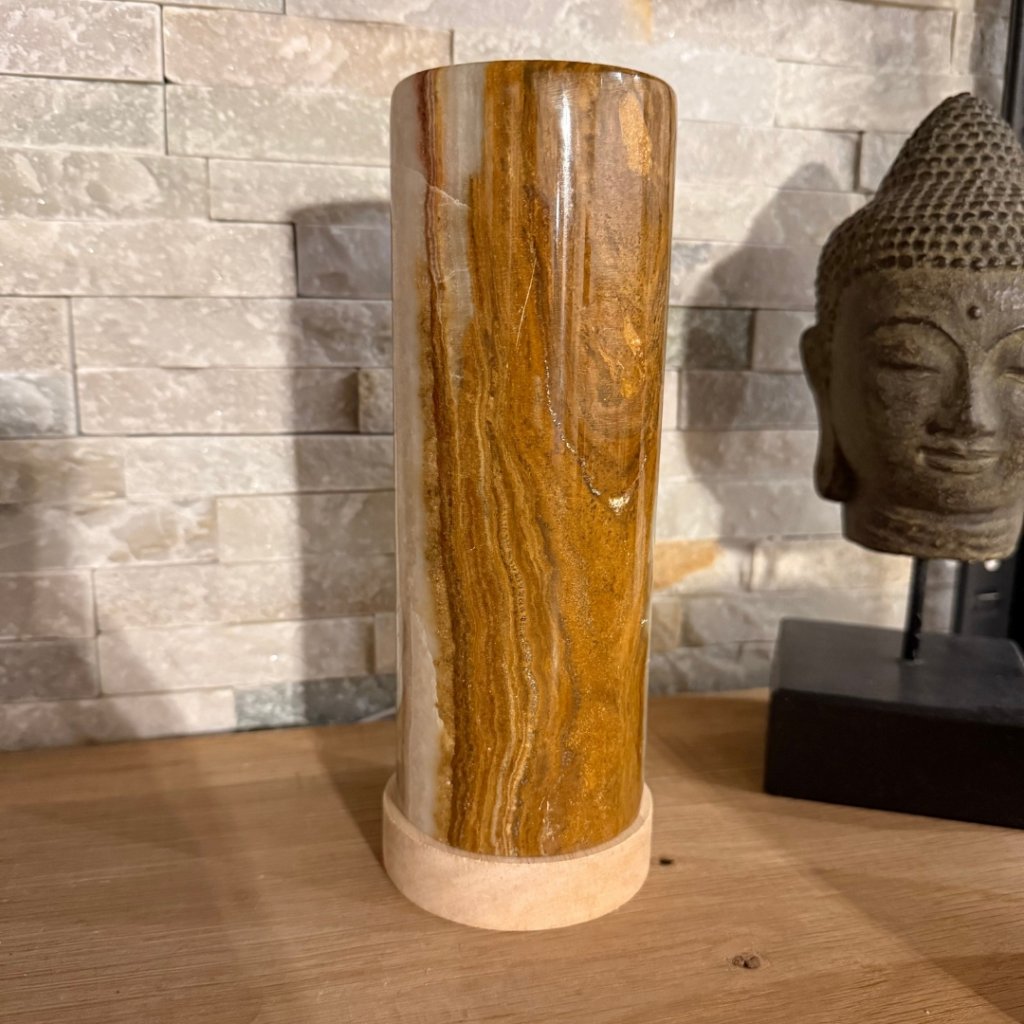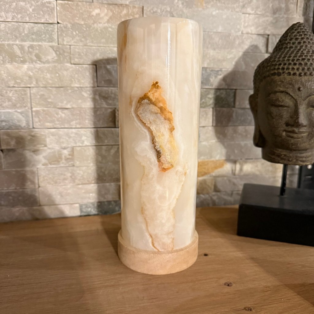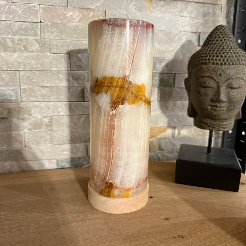 Se vzorem/žilkováním i světlá varianta, válcovitý tvar, materiál pákistánský onyx (Aragonit), na čajovou svíčku, výška cca 20 cm, velikost XL.