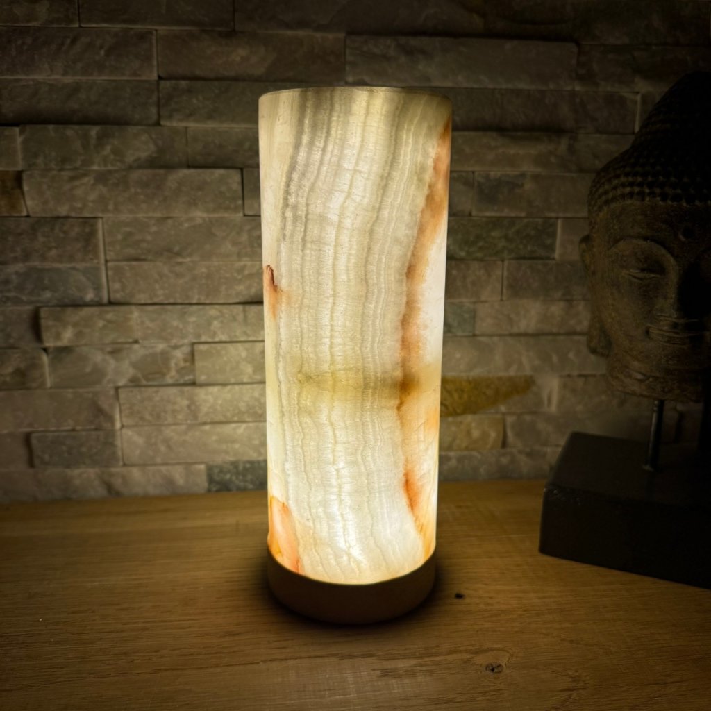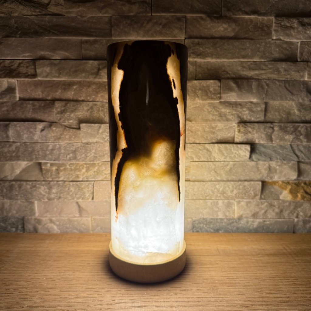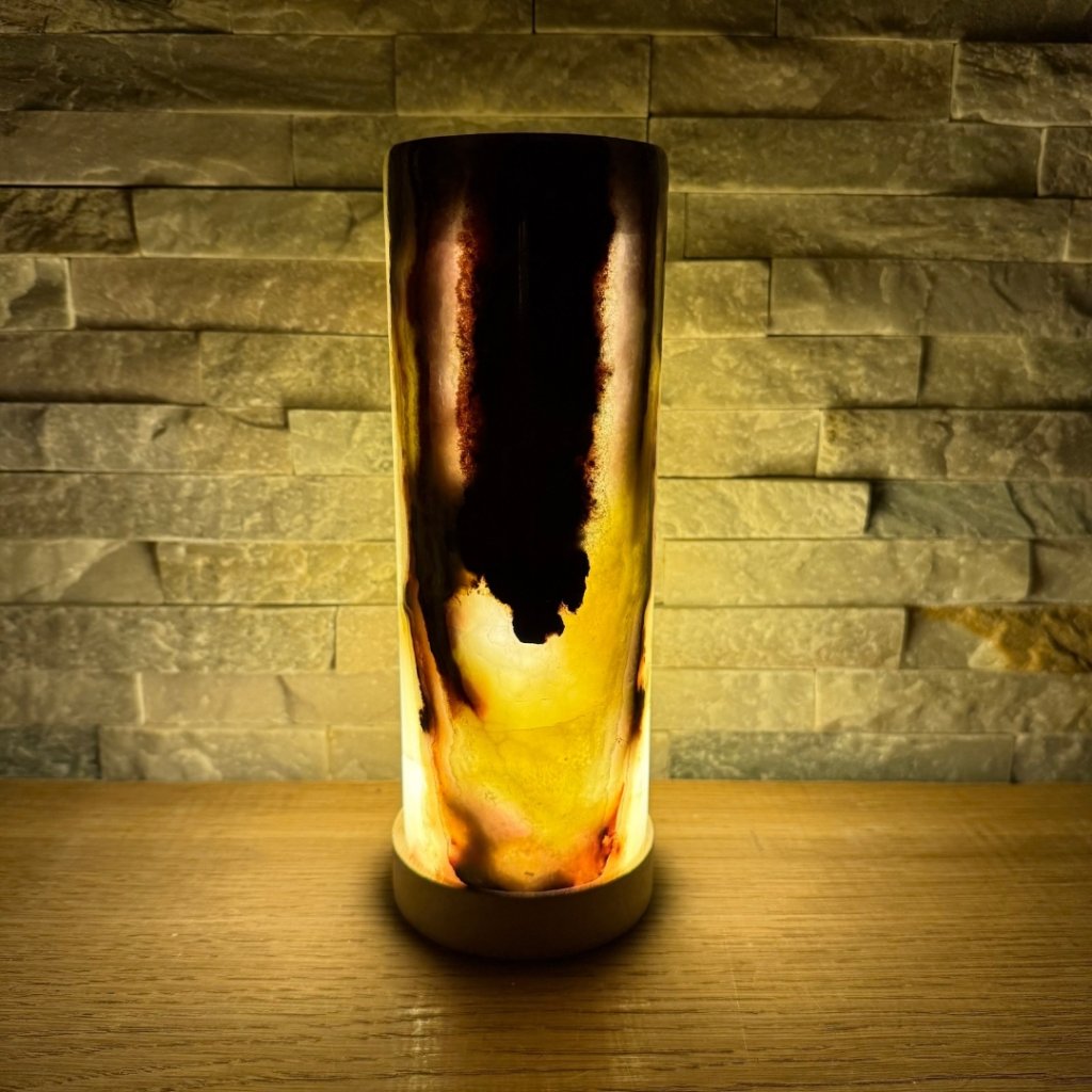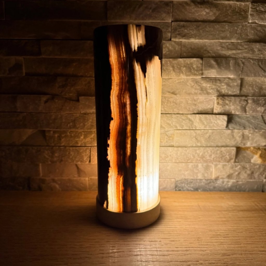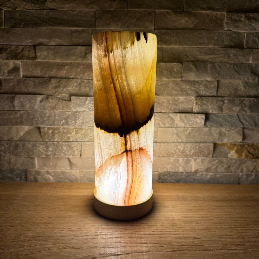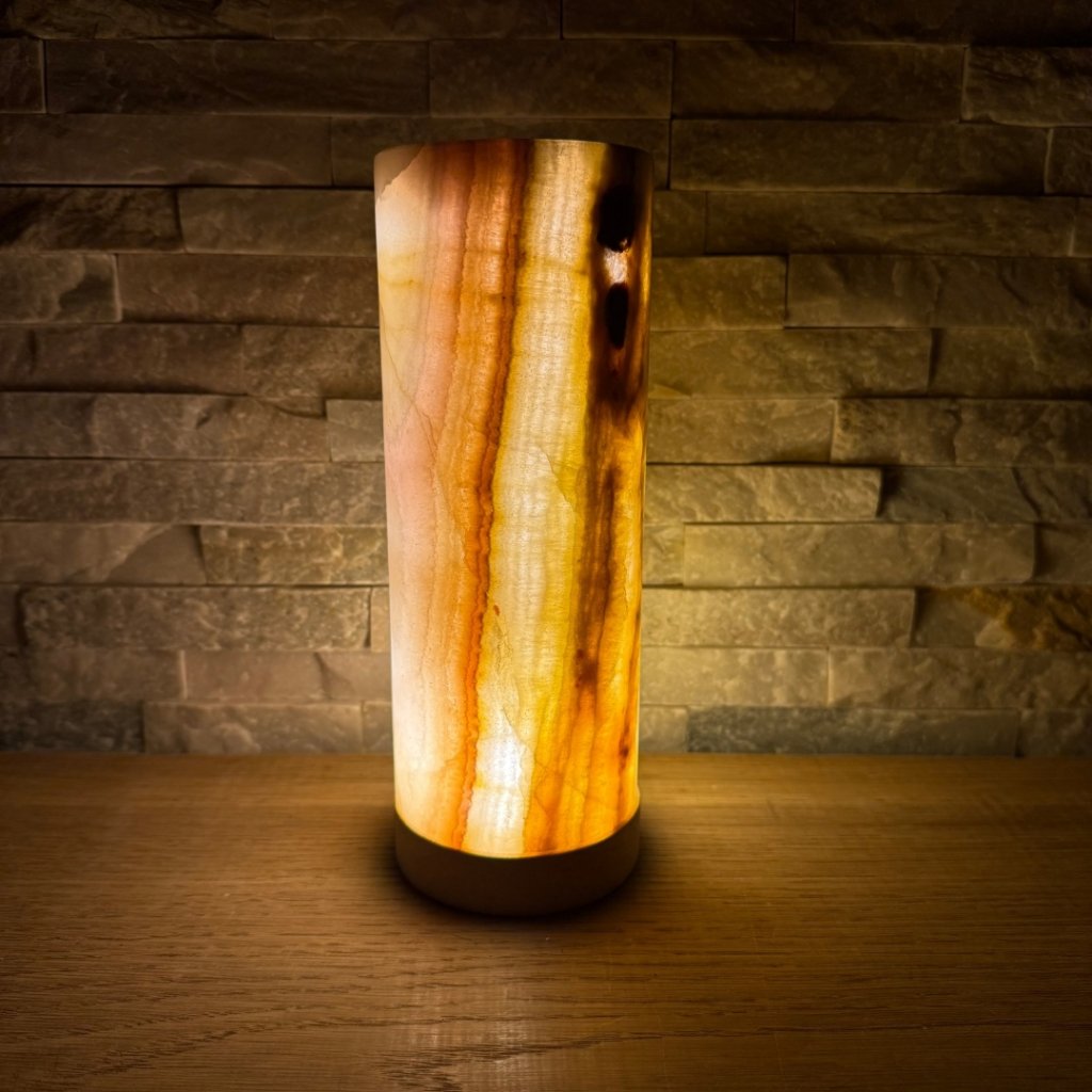 Se vzorem/žilkováním i světlá varianta, válcovitý tvar, materiál pákistánský onyx (Aragonit), na čajovou svíčku, výška cca 20 cm, velikost XL.
