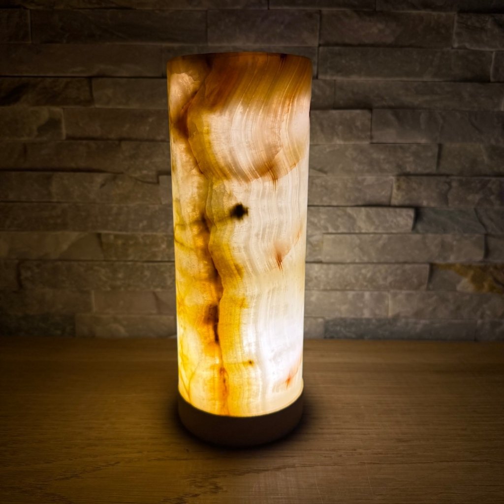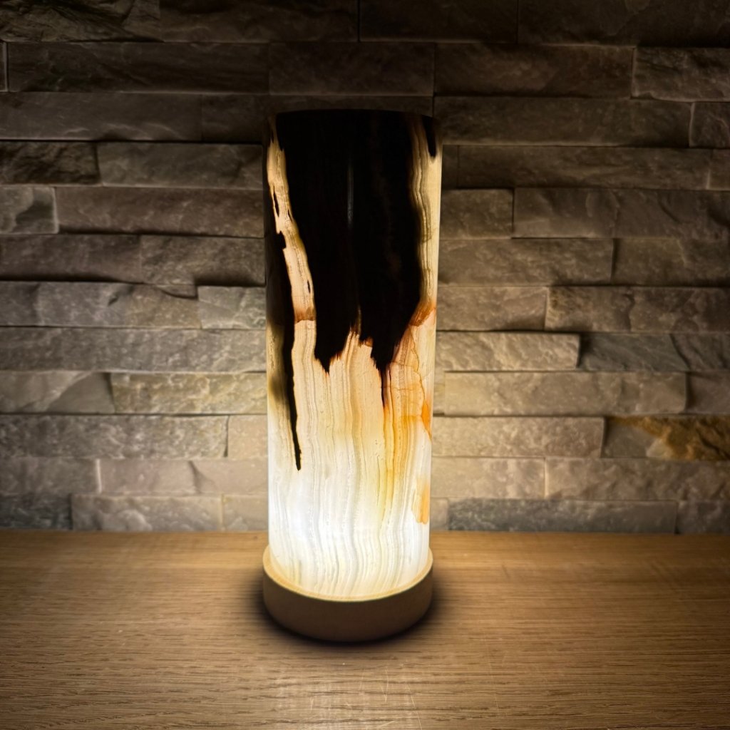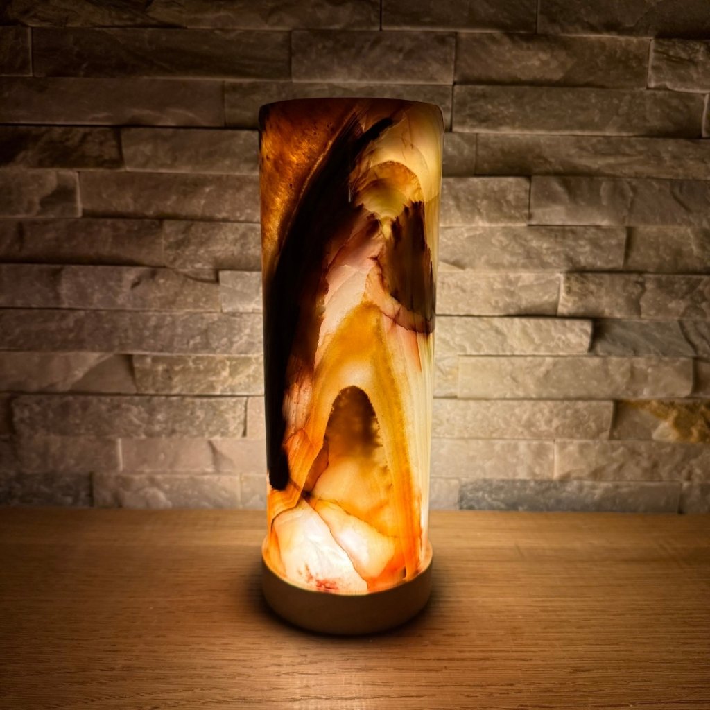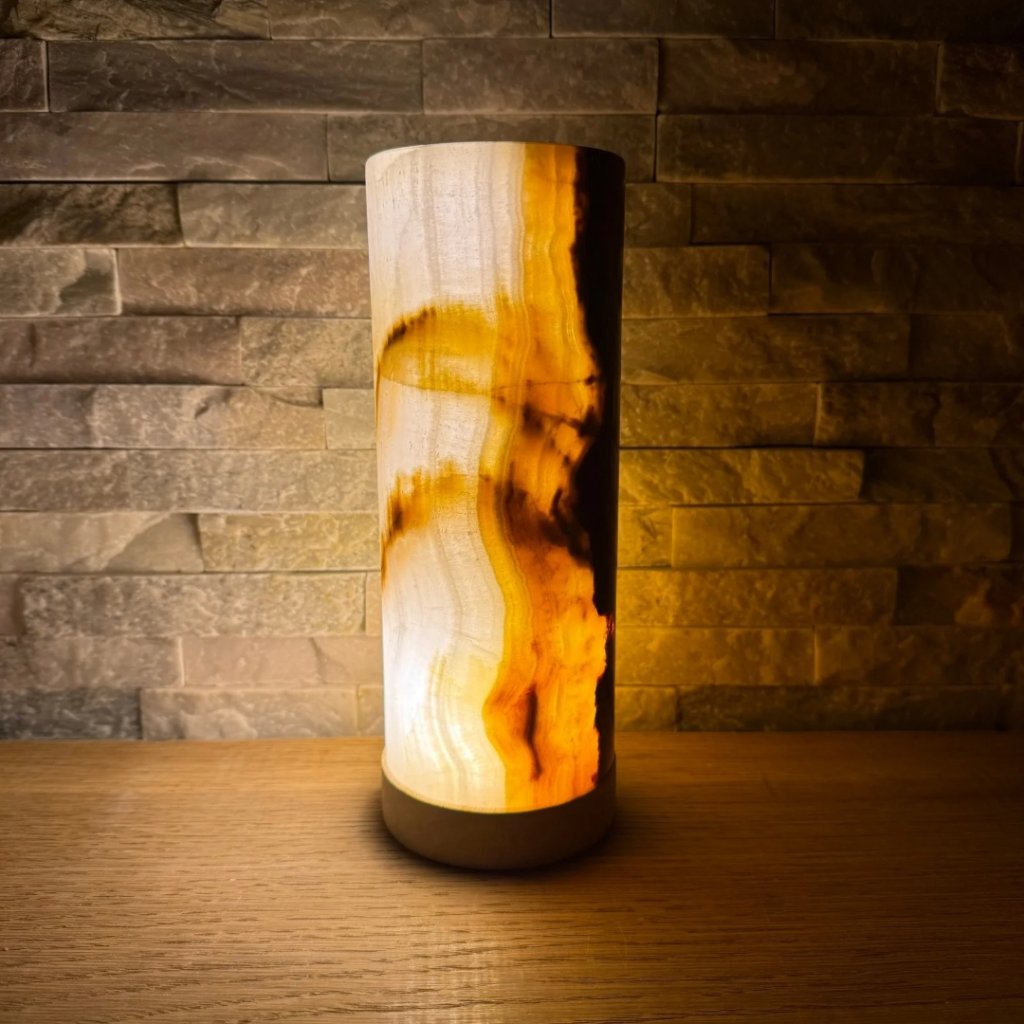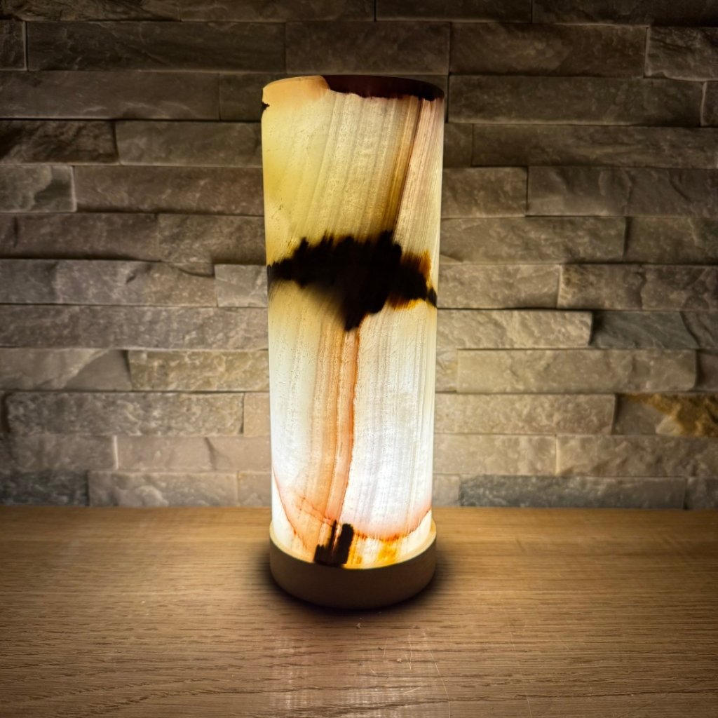 Se vzorem/žilkováním i světlá varianta, válcovitý tvar, materiál pákistánský onyx (Aragonit), na čajovou svíčku, výška cca 20 cm, velikost XL.