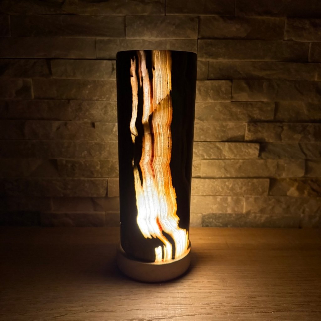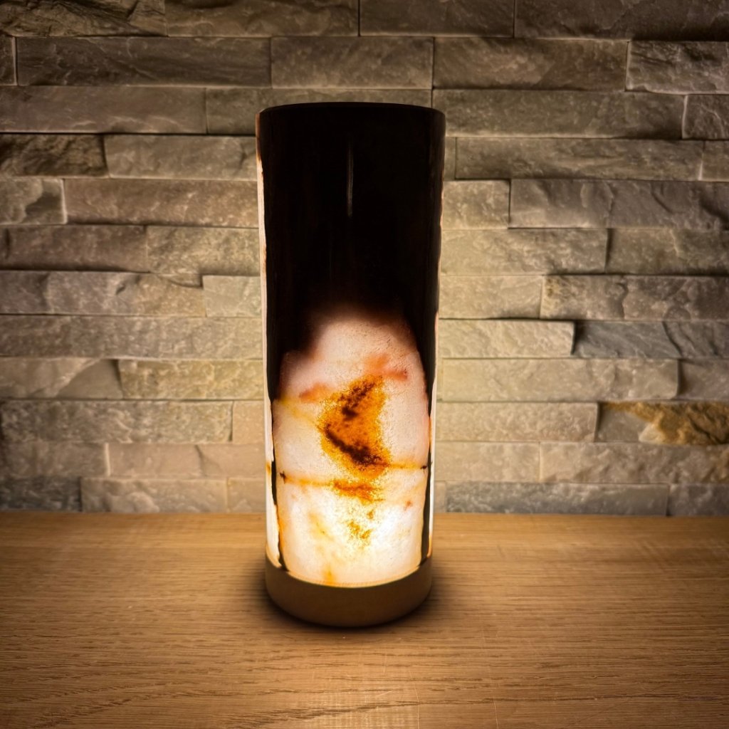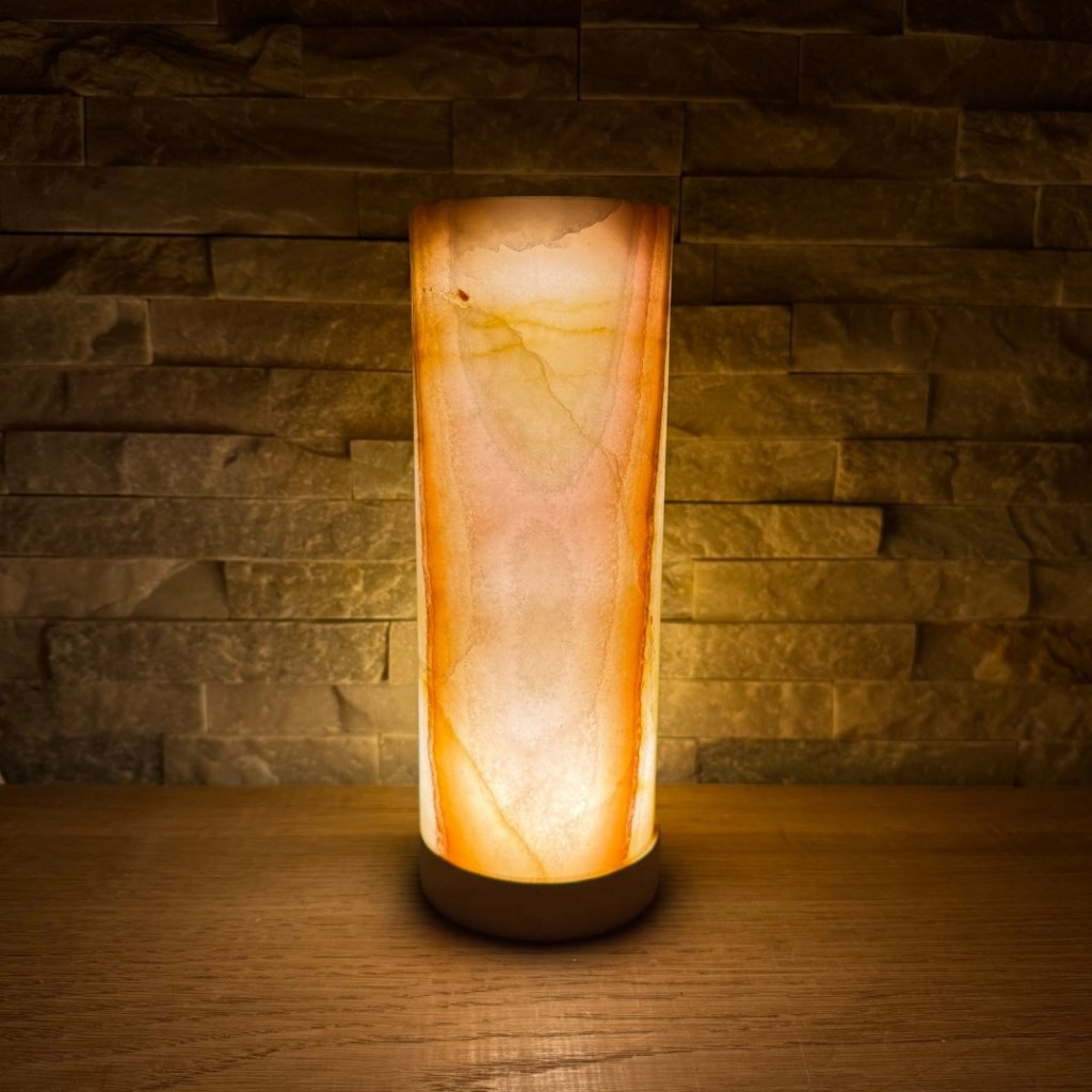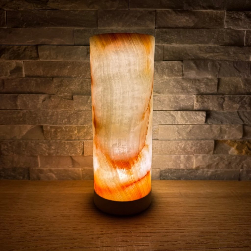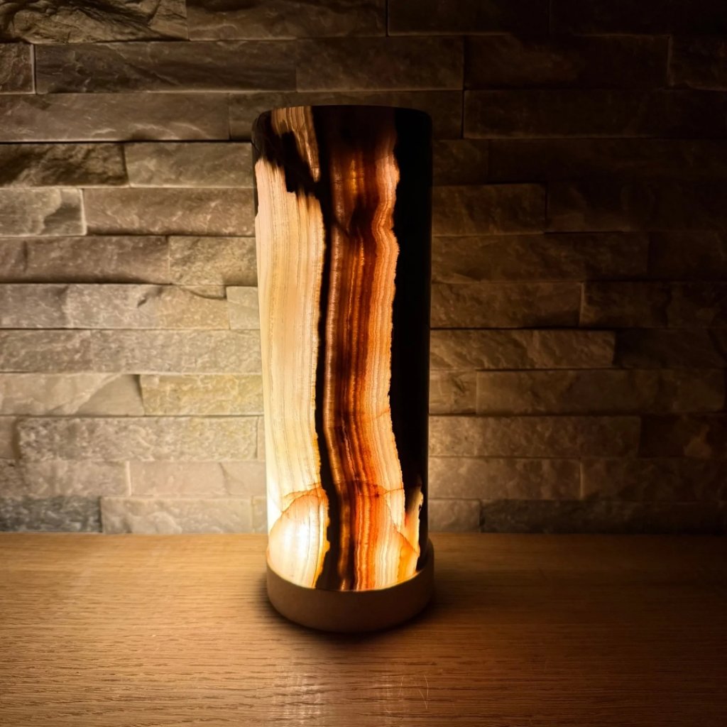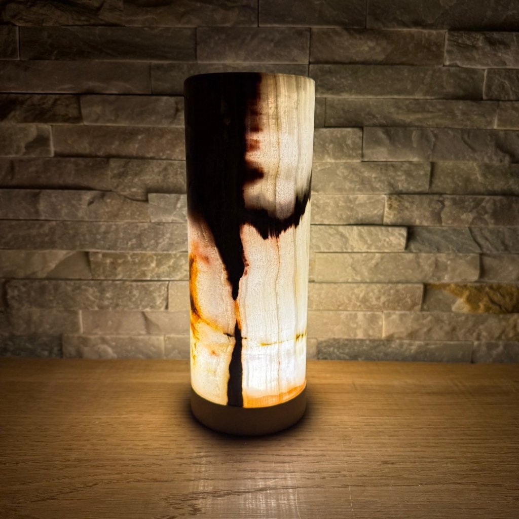 Se vzorem/žilkováním i světlá varianta, válcovitý tvar, materiál pákistánský onyx (Aragonit), na čajovou svíčku, výška cca 20 cm, velikost XL.