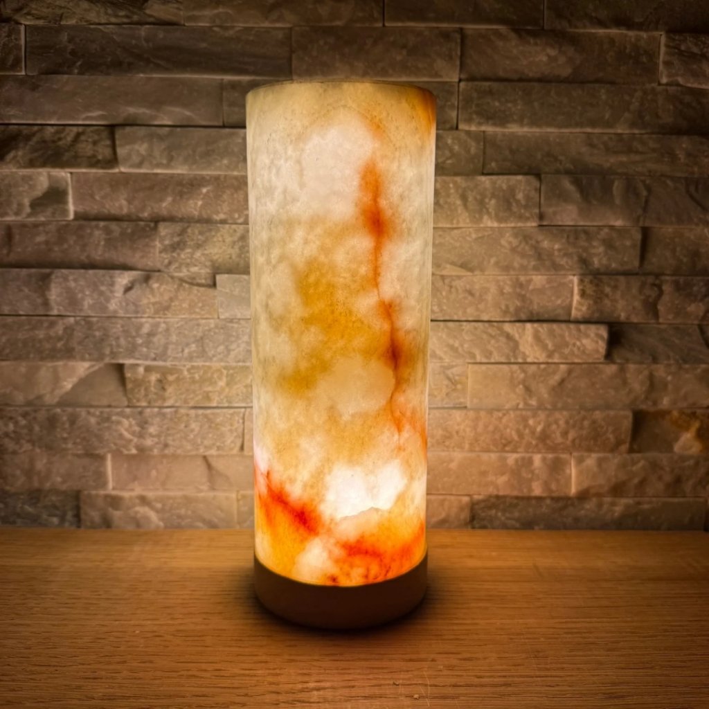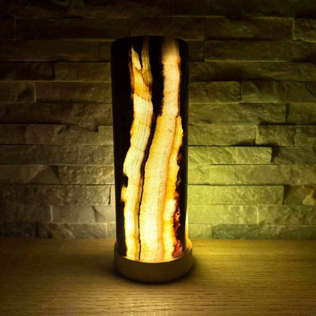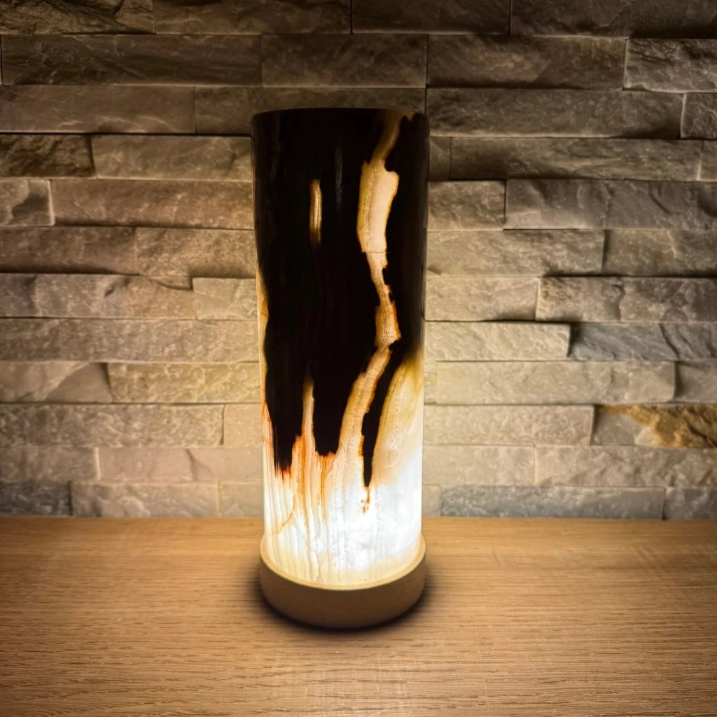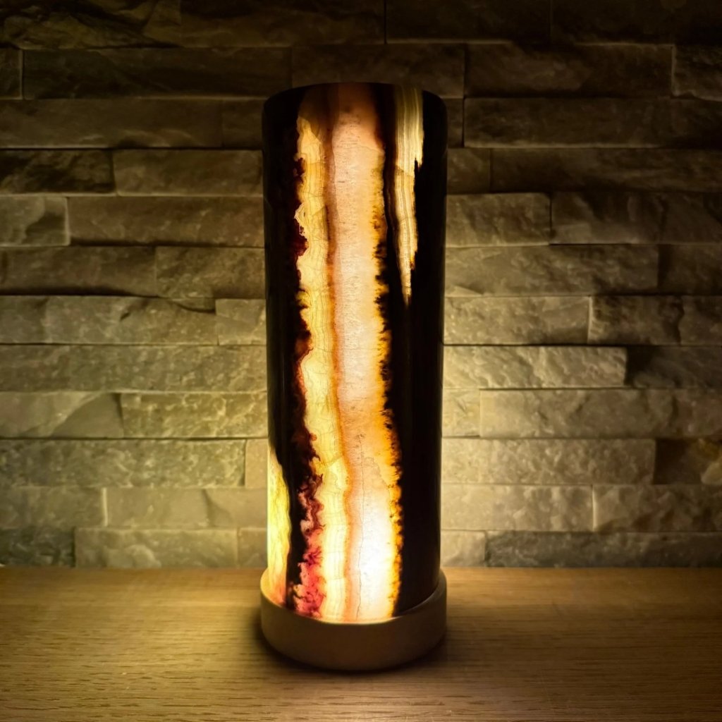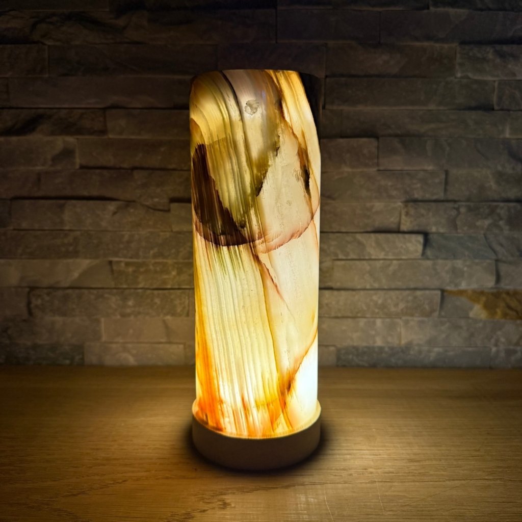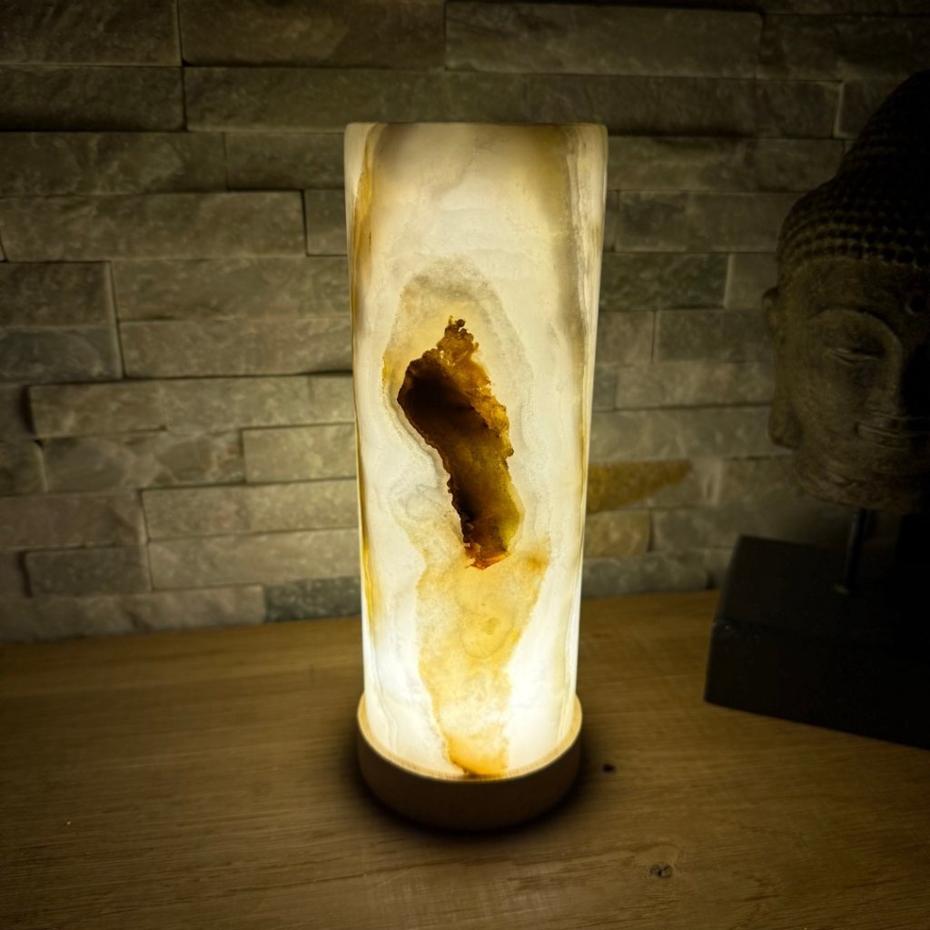 Se vzorem/žilkováním i světlá varianta, válcovitý tvar, materiál pákistánský onyx (Aragonit), na čajovou svíčku, výška cca 20 cm, velikost XL.