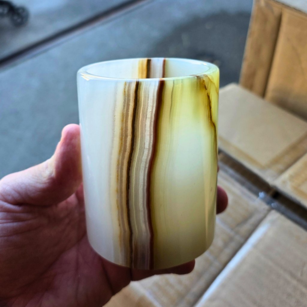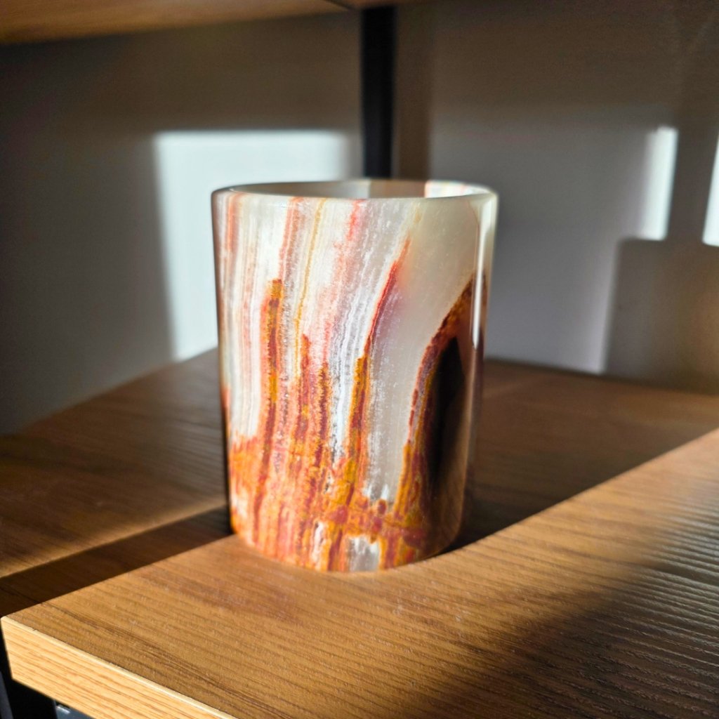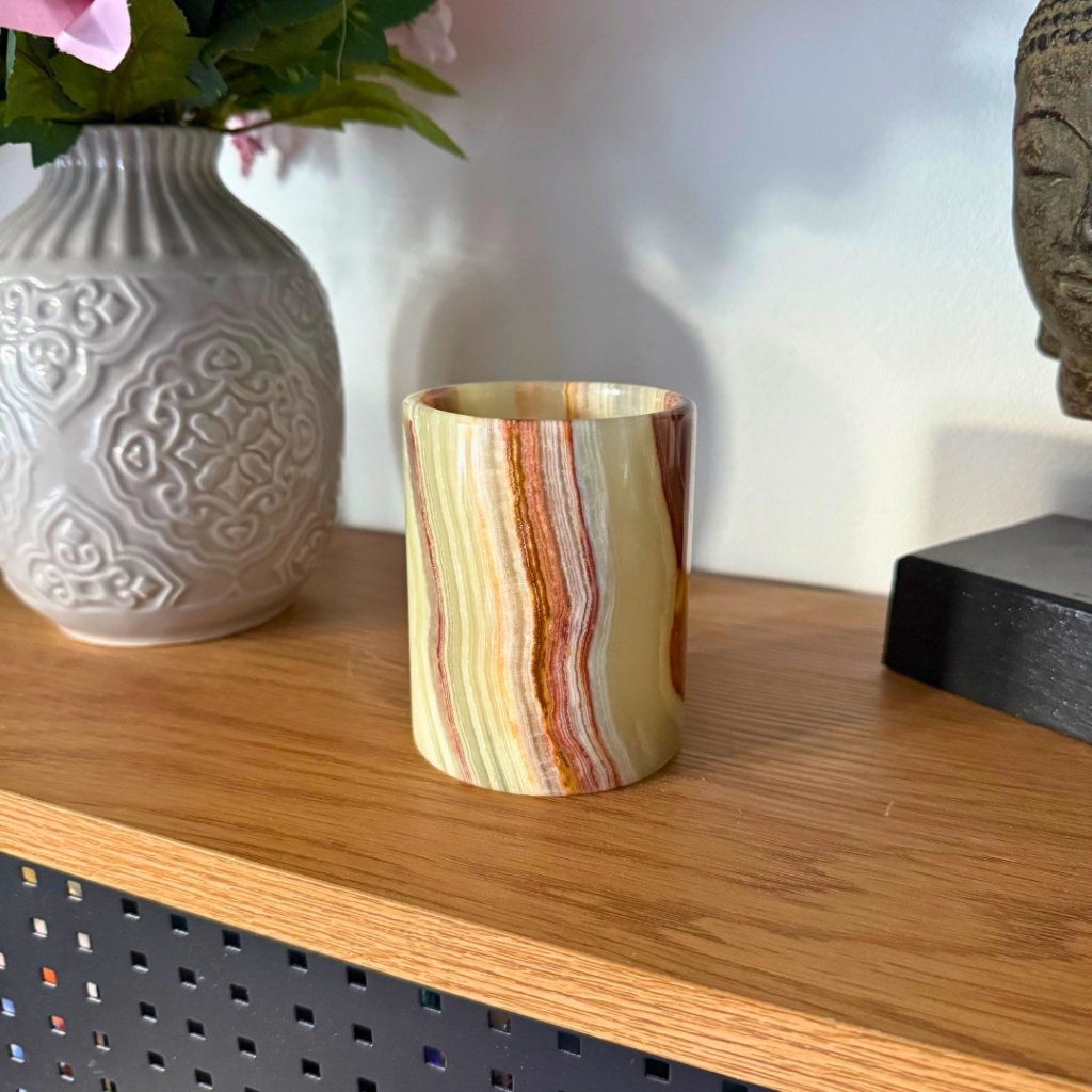 Se vzorem/žilkováním, válcovitý tvar, materiál pákistánský onyx (Aragonit), na čajovou svíčku, výška cca 9,5 cm, velikost M.