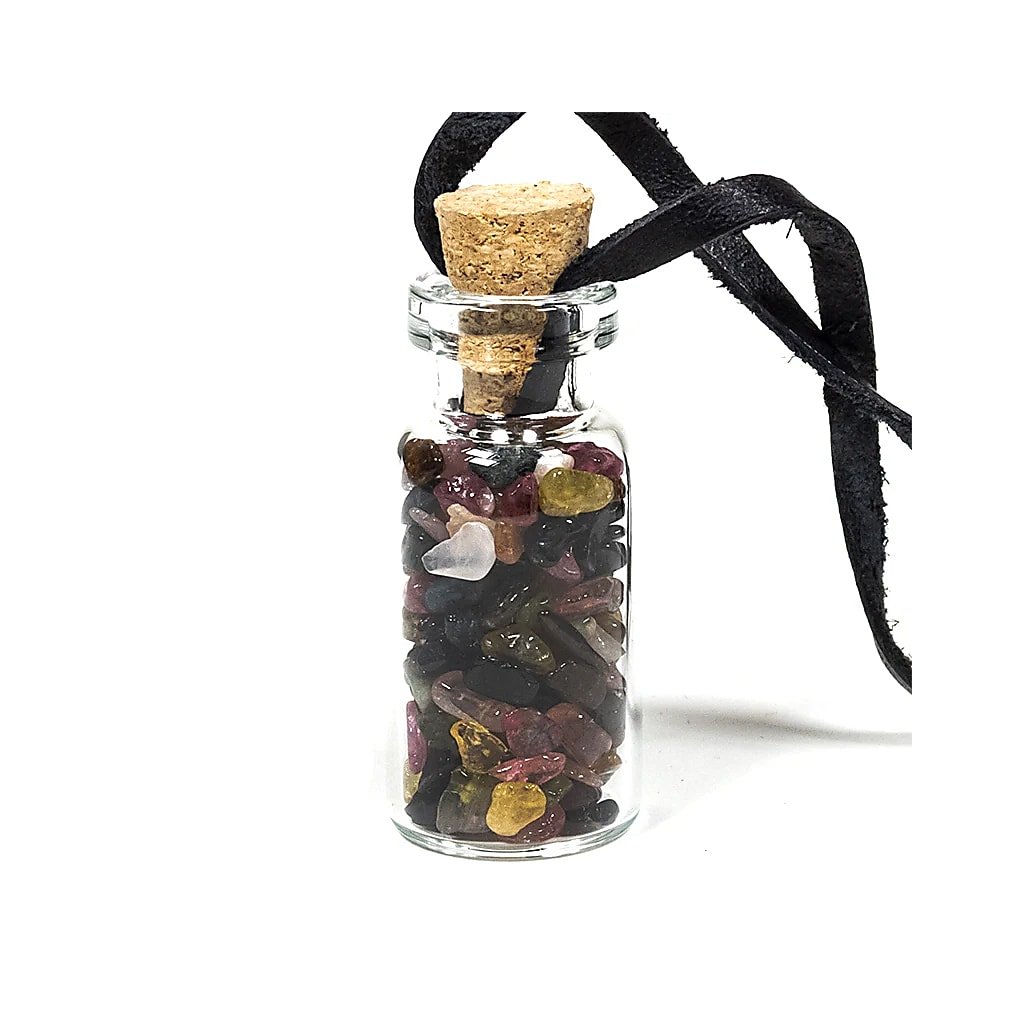 Turmalín ve skleněné lahvičce Velikost 4 cm, kožená sňůrka