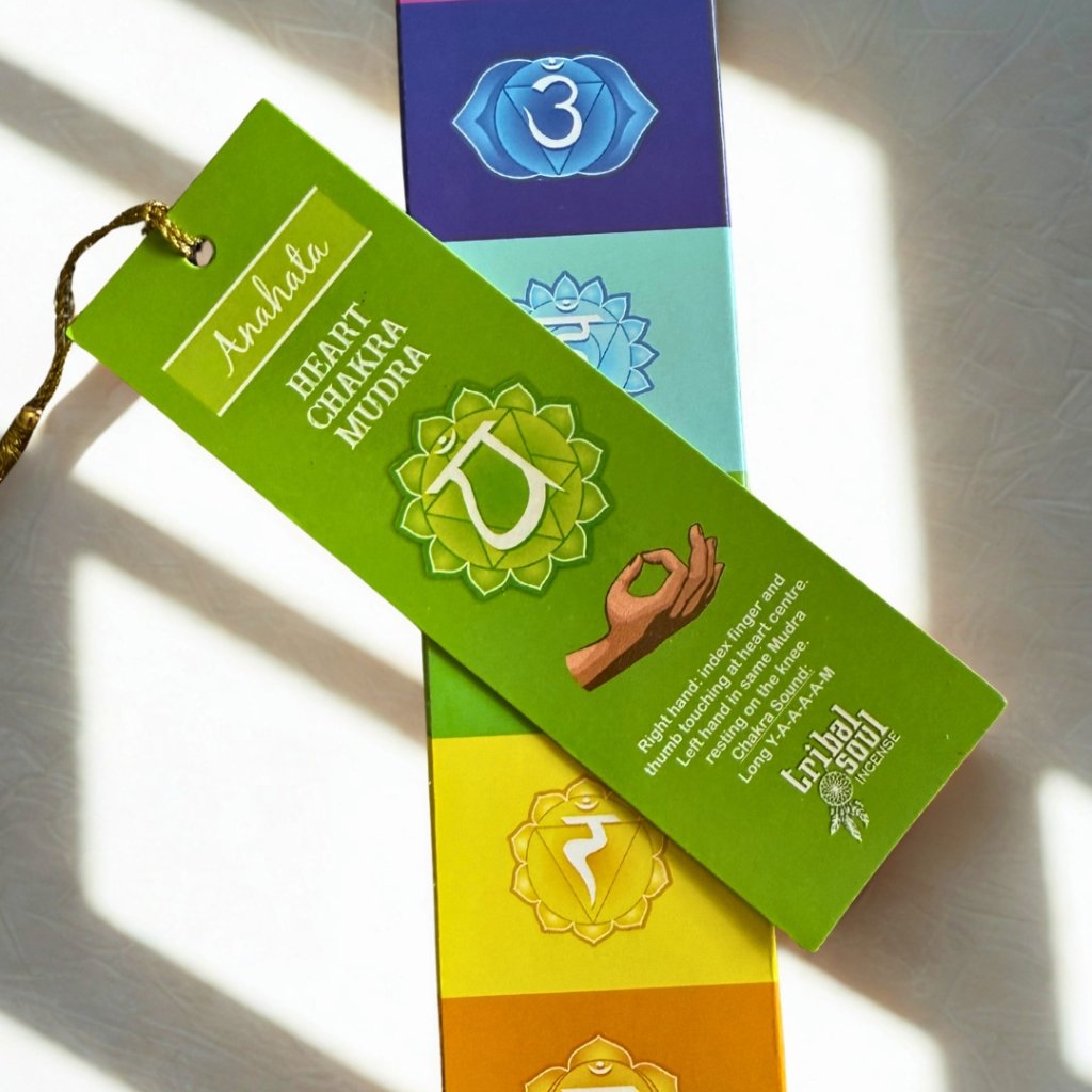Tyčinky jsou ručně válené v Indii, s označením bez dětské práce a eticky vyrobeno. V balení je obvykle 12–14 kusů (celkem 15 g), délka jedné tyčinky zhruba 20 cm. Doba hoření se pohybuje kolem 30–60 minut podle prostředí. Krabička má dárkový charakter a uvnitř najdete jednu kartičku k čakrám s mudrou (výběr je náhodný).