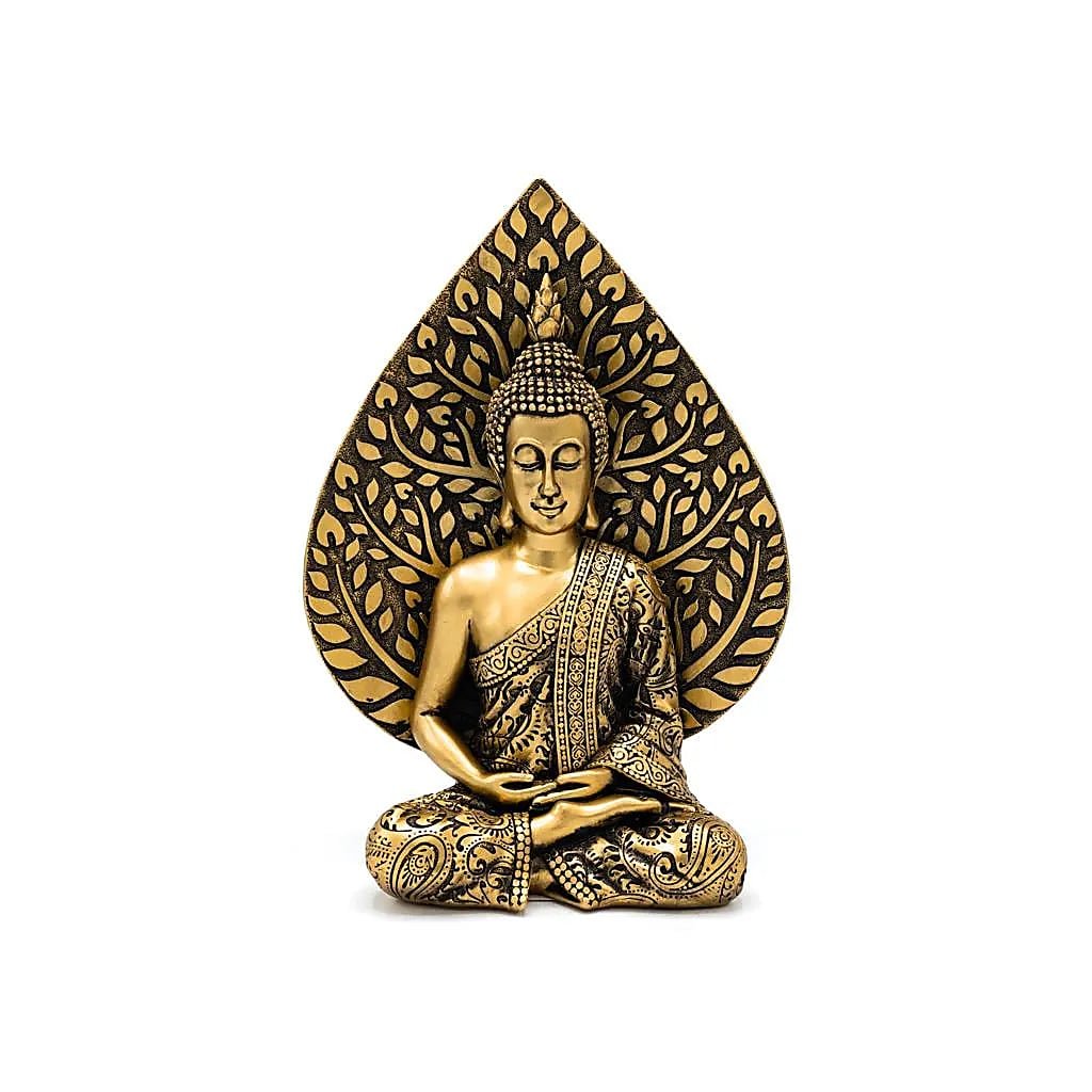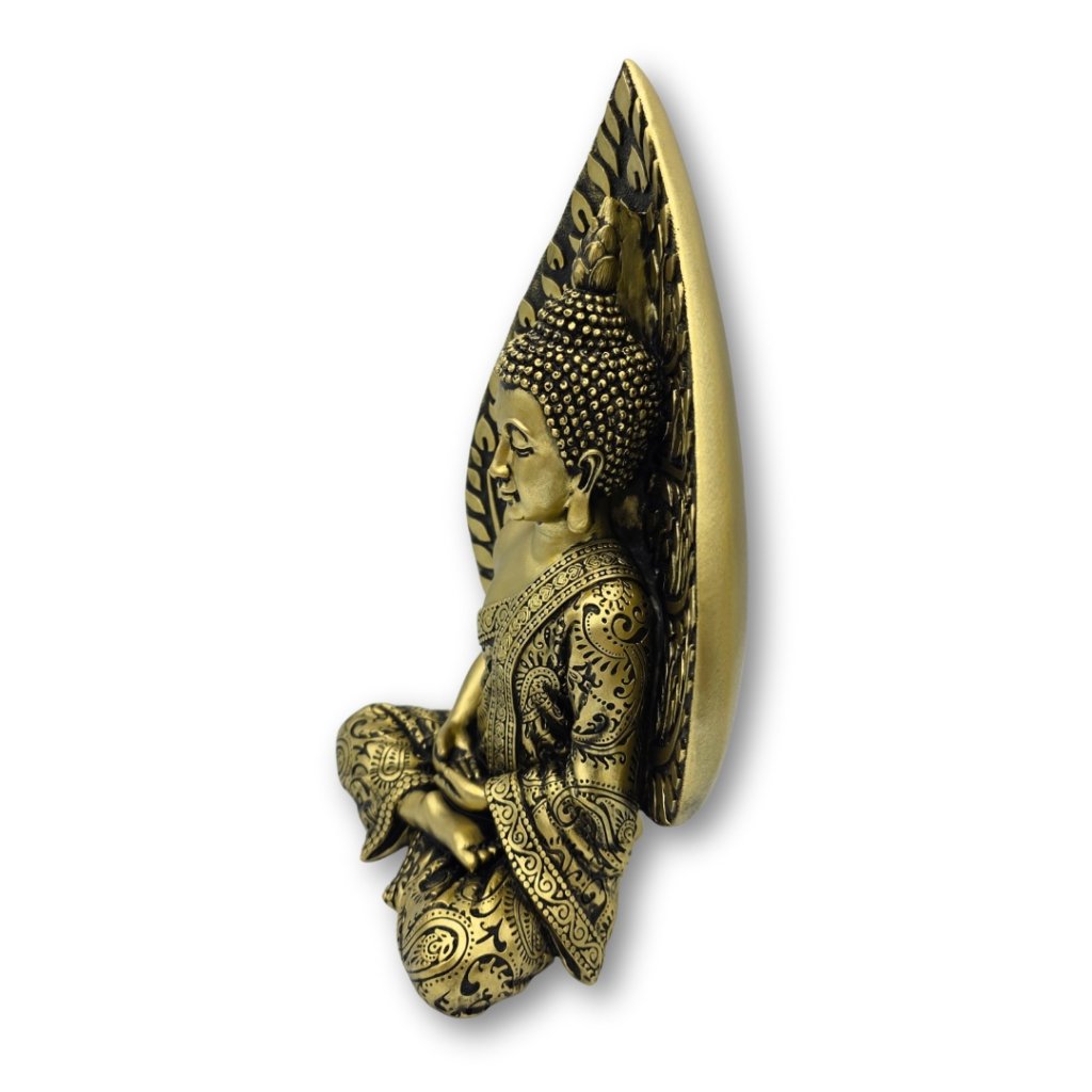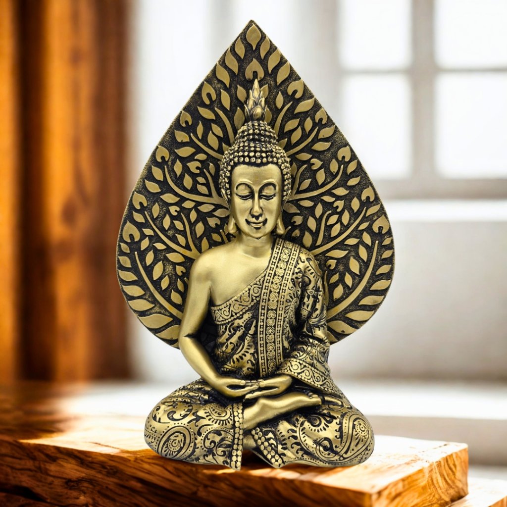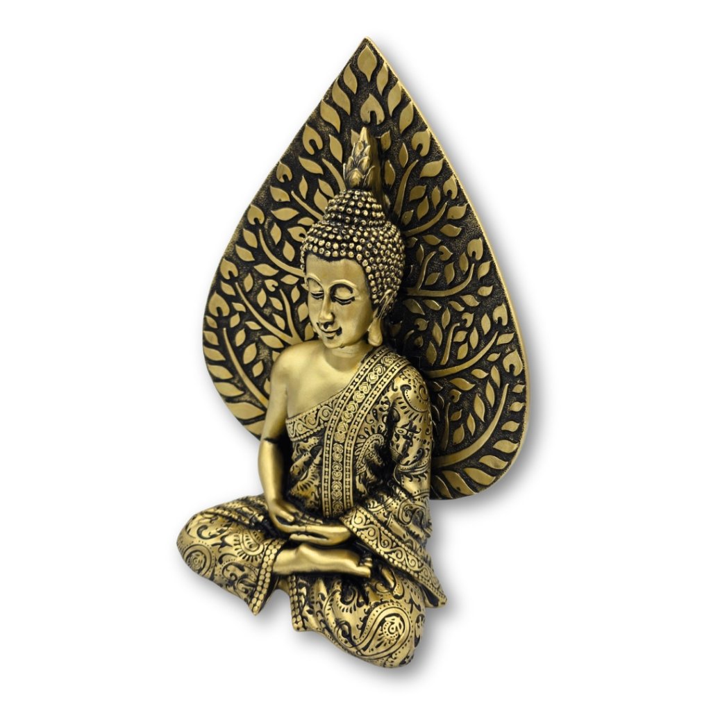 Zlatá soška meditujícího Buddhy v thajském stylu přináší do prostoru klid, soustředění a jemnou připomínku vědomého nadechnutí. Buddha sedí v meditačním postoji před stylizovaným listem Bodhi, který odkazuje na okamžik osvícení pod posvátným stromem. Teplý zlatý odstín a jemné detaily na oděvu i listu zaujmou na první pohled.