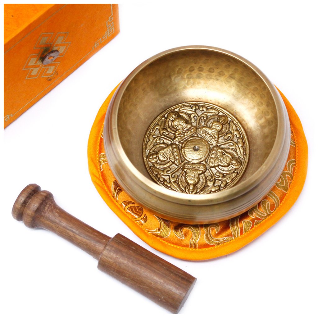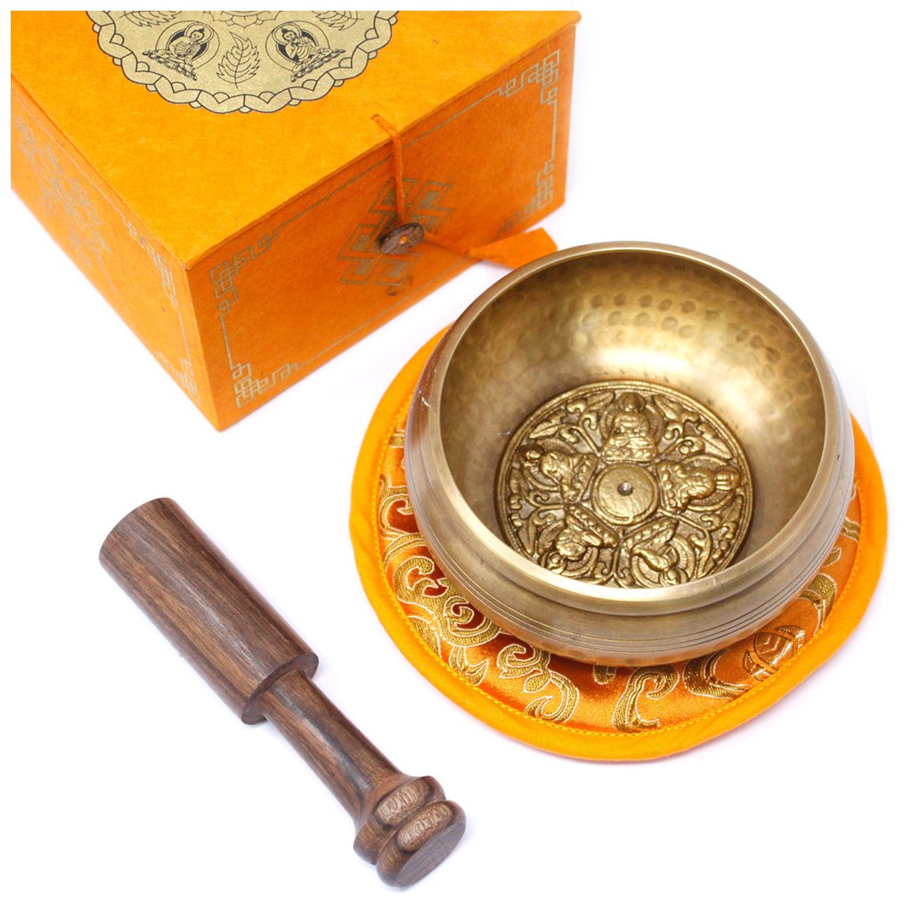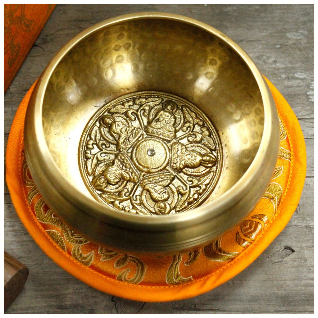 Ručně tepaná a gravírovaná zpívající mísa z Nepálu je vyrobena z mosazi tradiční technikou předávanou po generace. Součástí dárkové sady je miska o průměru 10 cm (výška cca 6 cm), dřevěná palička, polštářek a dárková krabička z lokta papíru. Vnitřní dno zdobí reliéf pěti Buddhů, který symbolizuje moudrost, ochranu a rovnováhu.