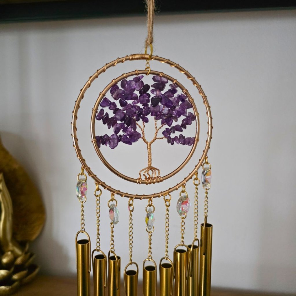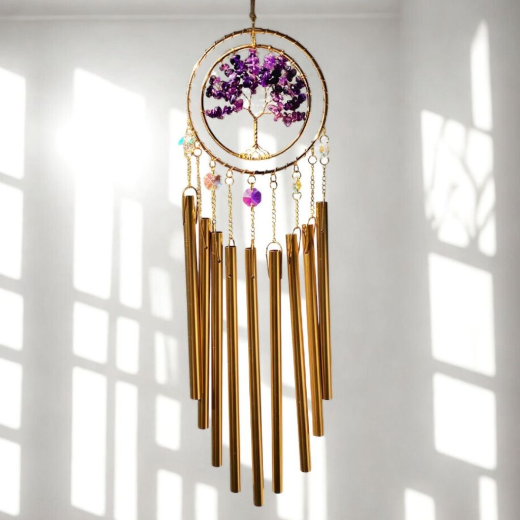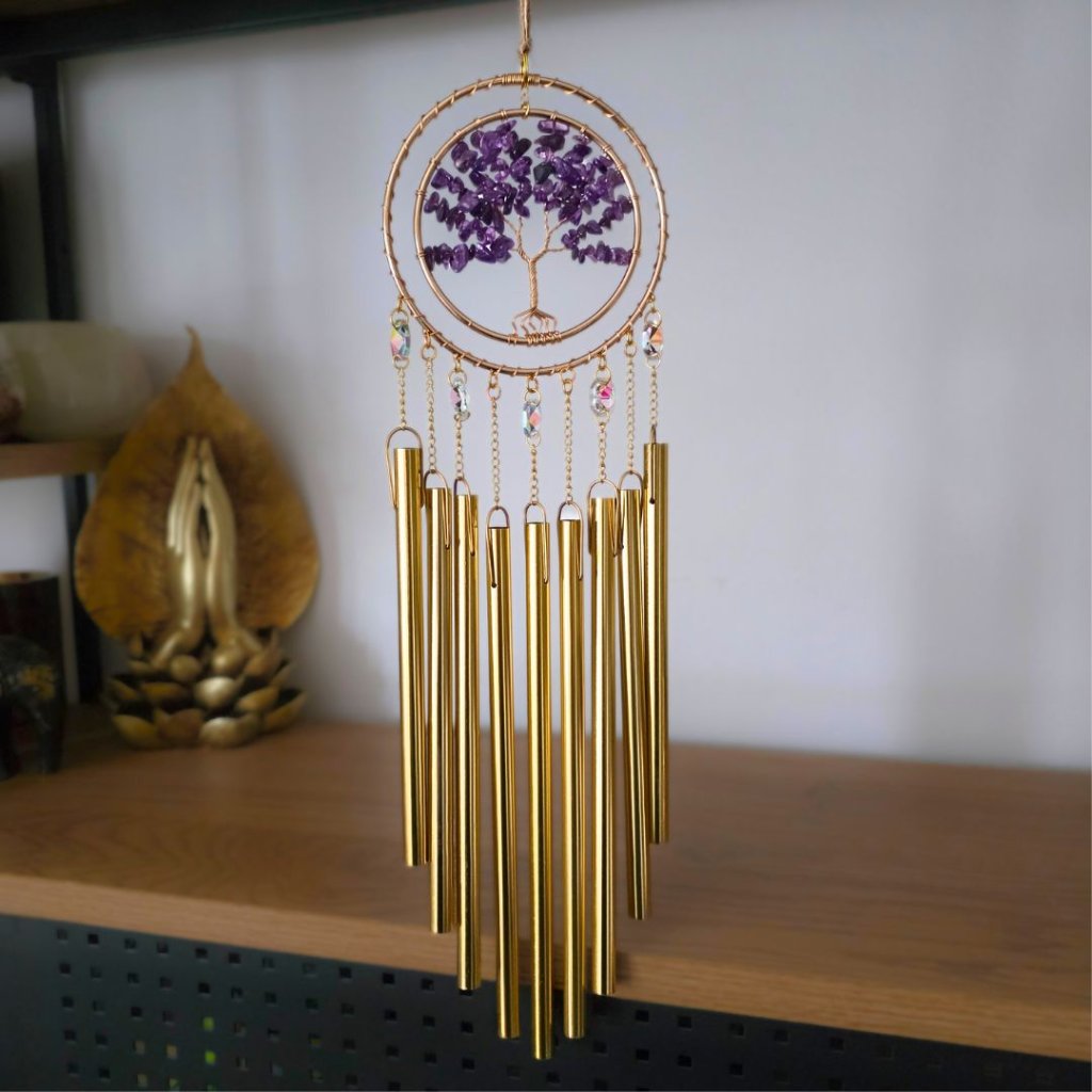 Jemná zvonkohra se stromem života z ametystu propojuje světlo, zvuk a symboliku v jednoduché, ale výrazné dekoraci. Při každém pohybu vzduchu se rozezní kovové trubky a drobné krystaly zachytí světlo do jemných odlesků. V prostoru vytváří klidnější, vyváženější atmosféru, je slyšet, ale nepůsobí rušivě.