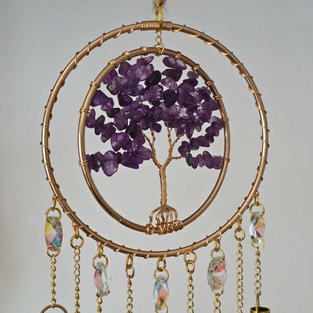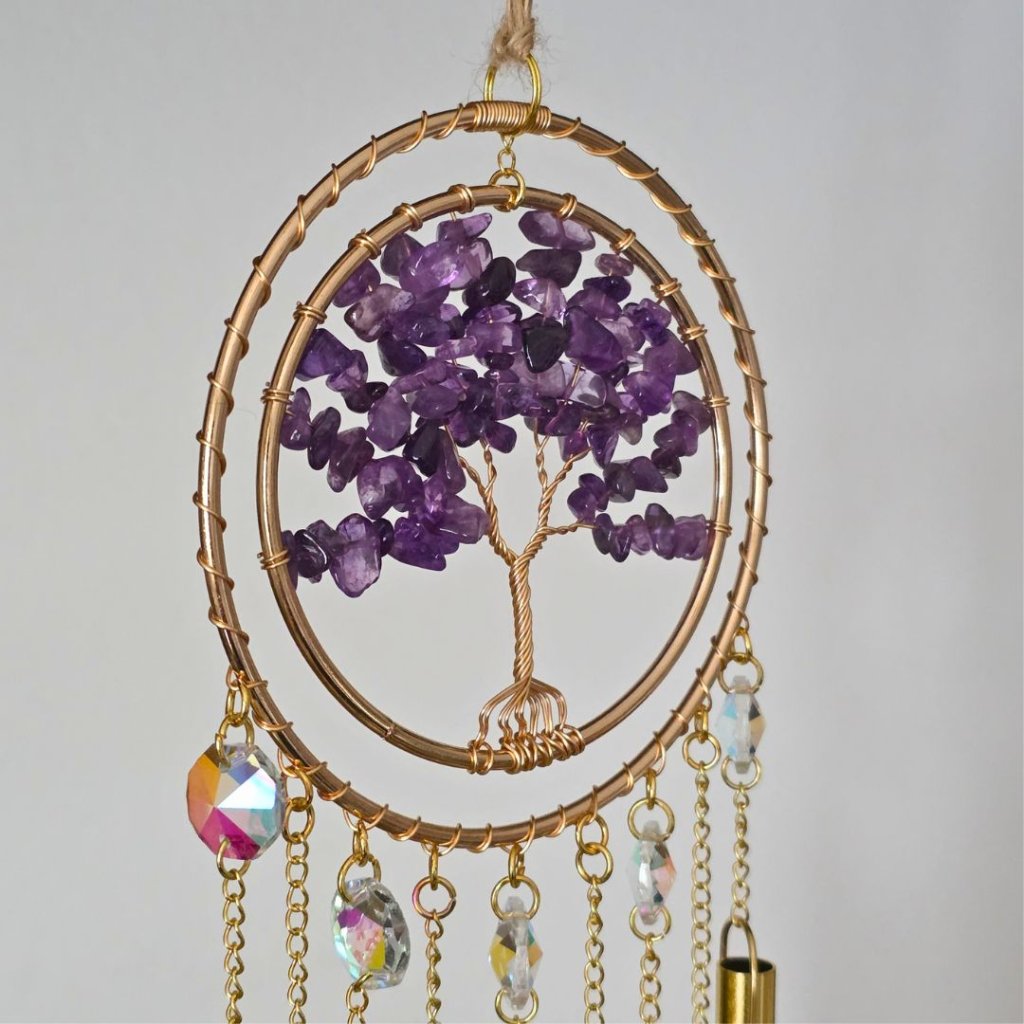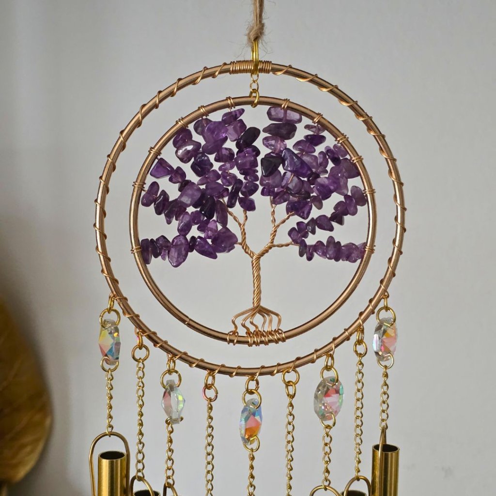 Jemná zvonkohra se stromem života z ametystu propojuje světlo, zvuk a symboliku v jednoduché, ale výrazné dekoraci. Při každém pohybu vzduchu se rozezní kovové trubky a drobné krystaly zachytí světlo do jemných odlesků. V prostoru vytváří klidnější, vyváženější atmosféru, je slyšet, ale nepůsobí rušivě.